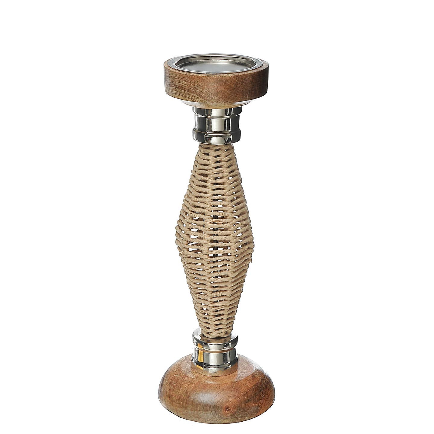 Elevate your ambiance with this refined candle holder, a perfect blend of rustic texture and elegant detail. Handcrafted from smooth mango wood, wrapped with intricately woven raffia, and accented with polished brass fittings, this piece strikes a harmonious balance between earthy charm and sophisticated design. The hourglass silhouette adds a touch of modern artistry, while the natural materials lend warmth and versatility to any setting—from boho-chic corners to upscale dining tables. Ideal for taper or pillar candles, it’s more than a holder—it’s a style statement.