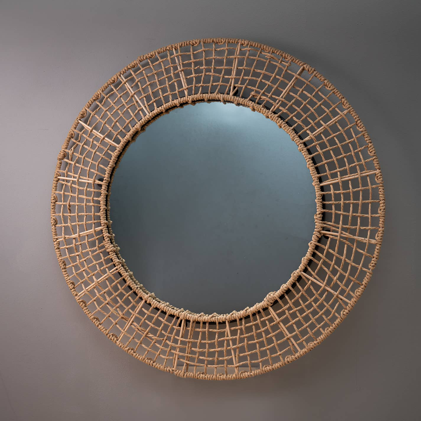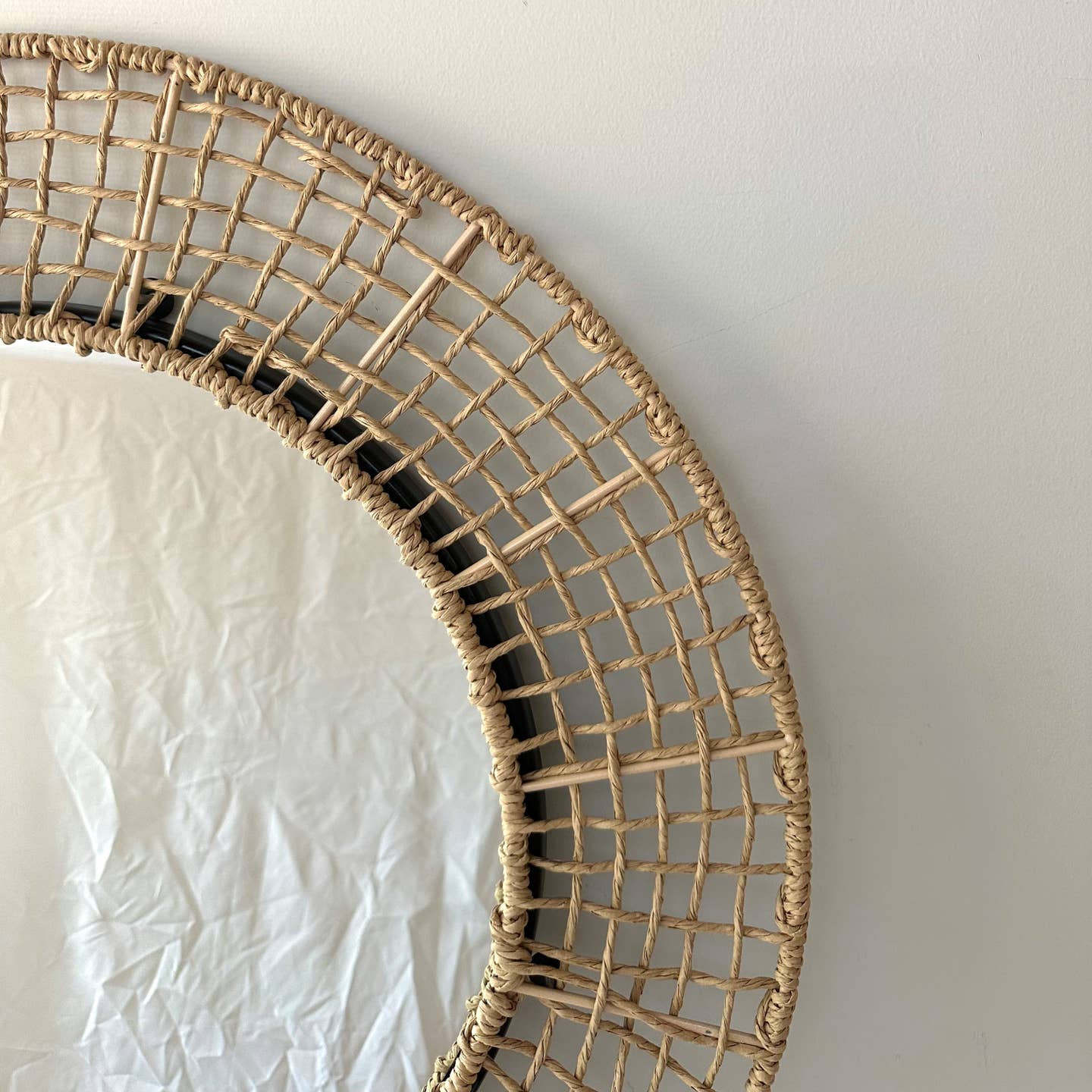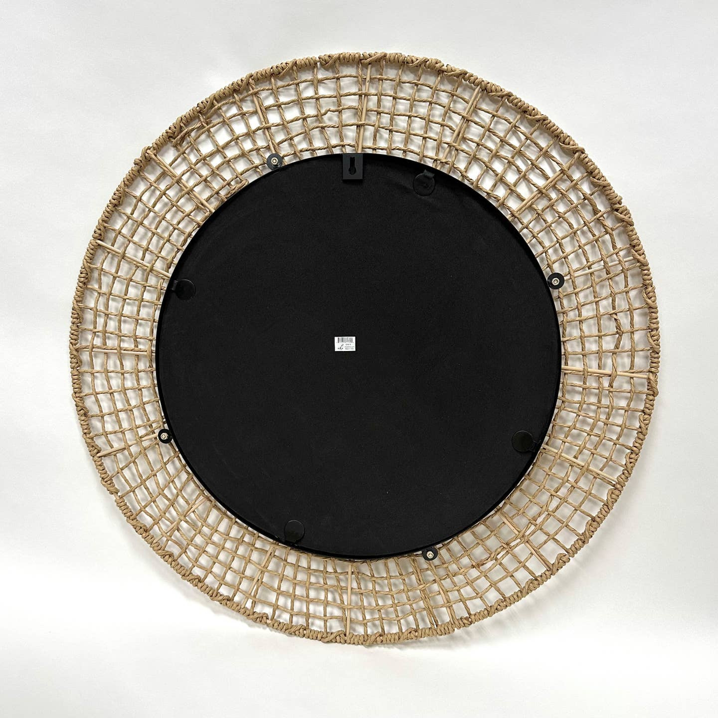 Elevate your interior with the breezy charm of this handcrafted round wall mirror, intricately woven with natural raffia. The open-weave design around the frame lends it an airy, organic look that effortlessly blends into coastal, bohemian, and earthy spaces. The light texture of raffia adds subtle depth and dimension while keeping the aesthetic soft and relaxed. Ideal as a statement piece in entryways, bedrooms, or above consoles, this mirror captures both function and artistry—perfect for those who love natural materials and laid-back sophistication.