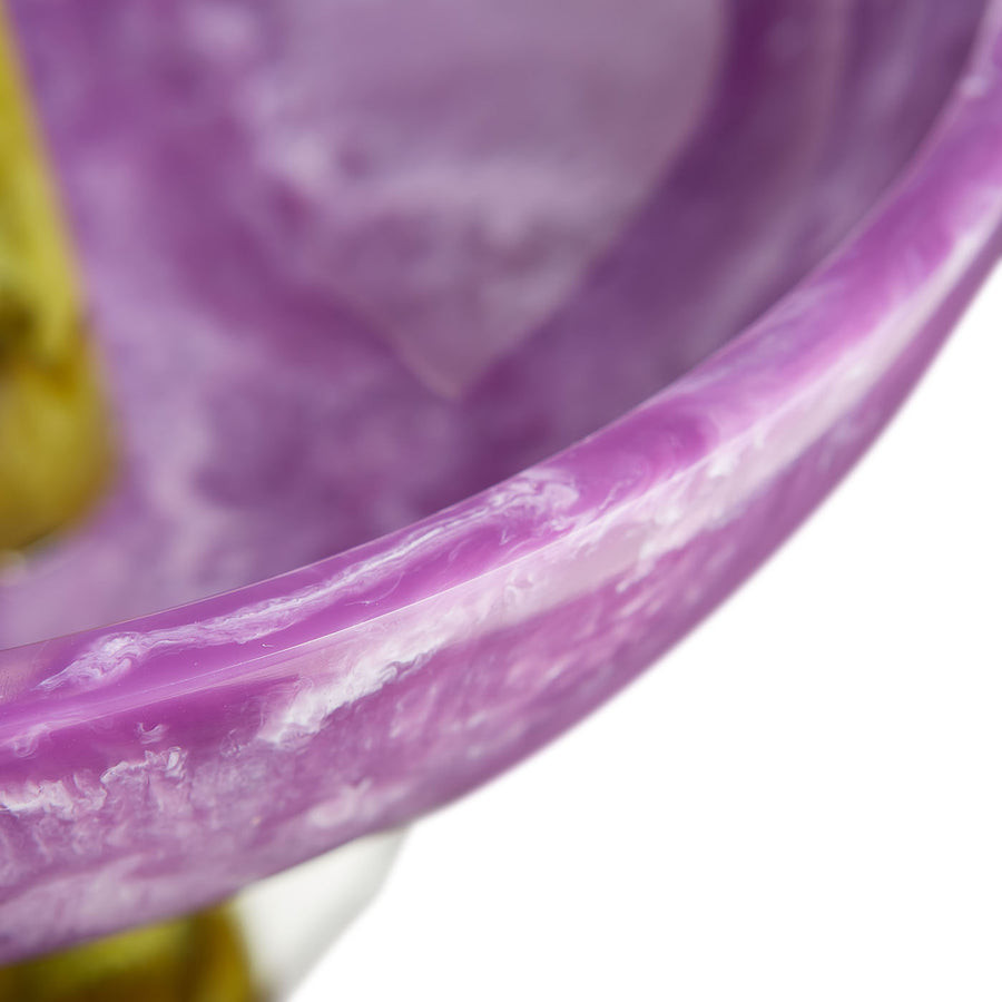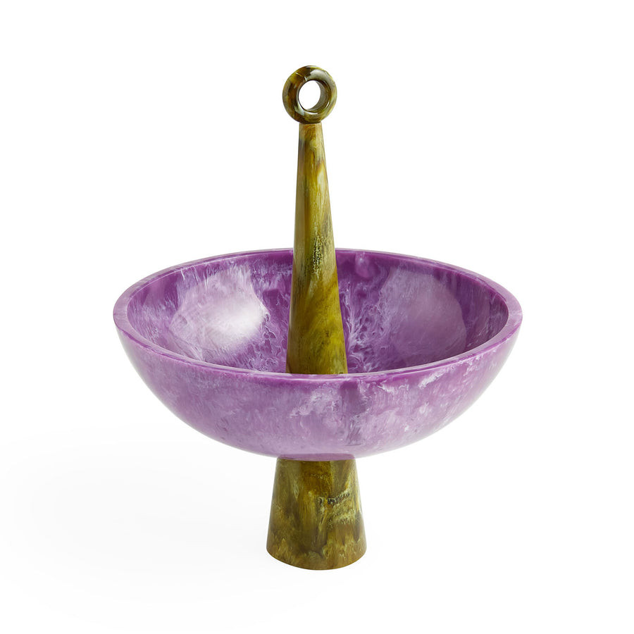 Elevate your décor with the Mustique Finial Bowl, a sculptural showpiece that blends artistic form with functional elegance. Crafted in a stunning marbled acrylic, this bowl features a rich amethyst-purple basin that exudes depth and movement through its swirling patterns. Rising boldly from the center is a contrasting olive-marbled finial, creating a striking vertical silhouette that draws the eye and transforms the piece into a true statement accent.