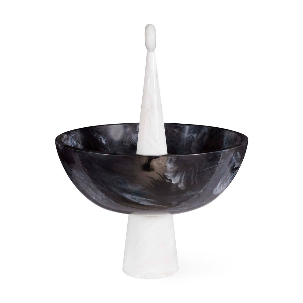 Sleek, sculptural, and undeniably modern — our Finial Resin Bowl redefines functional art. Expertly crafted from premium resin, this piece features a dramatic marbled black bowl resting gracefully on a smooth white conical base, crowned with a tall finial handle for a bold architectural touch.