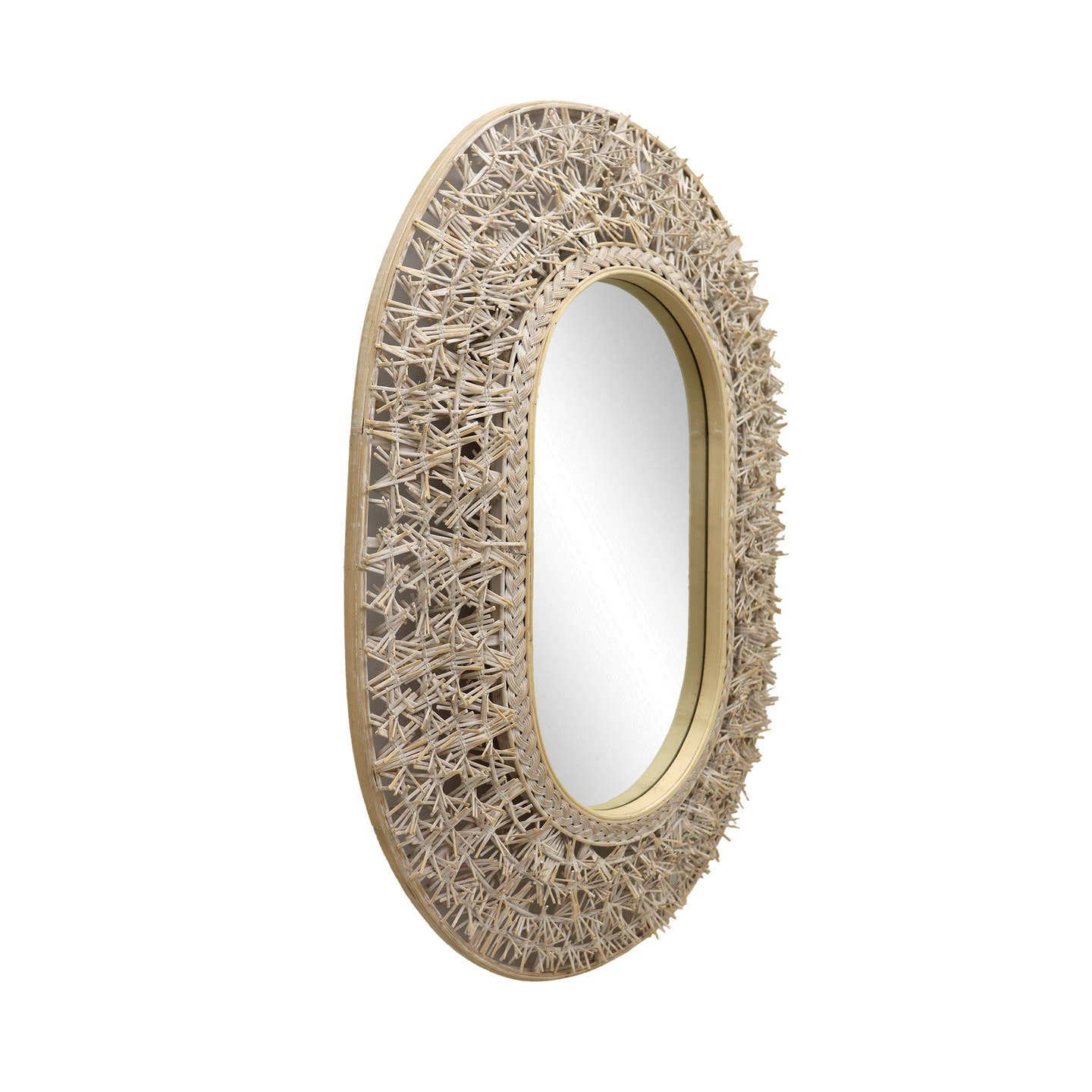 Bring organic charm and artisanal elegance to your space with this handcrafted wall mirror made from natural rattan and bamboo. Designed in a soft oval silhouette, the frame features a woven texture that artfully combines rustic bamboo strips with intricate rattan weaves. The natural tones and airy structure give it a relaxed, earthy appeal—perfect for bohemian, coastal, or contemporary interiors. Whether placed in an entryway, bedroom, or living area, this mirror adds warmth, texture, and character to any wall it adorns.