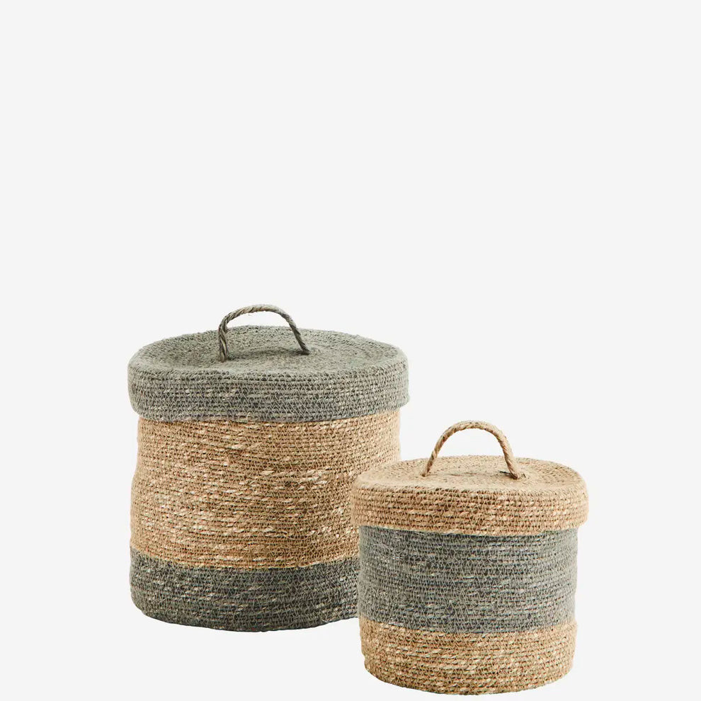 Each basket includes a matching lid with a loop handle for easy access and neat storage. Perfect for organizing throws, toys, laundry, or small essentials, these baskets combine practicality with artisan craftsmanship. Their textured, organic finish adds warmth and authenticity to any living space — making them as beautiful as they are useful.