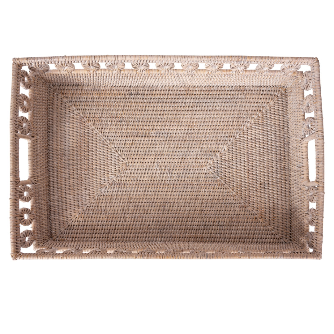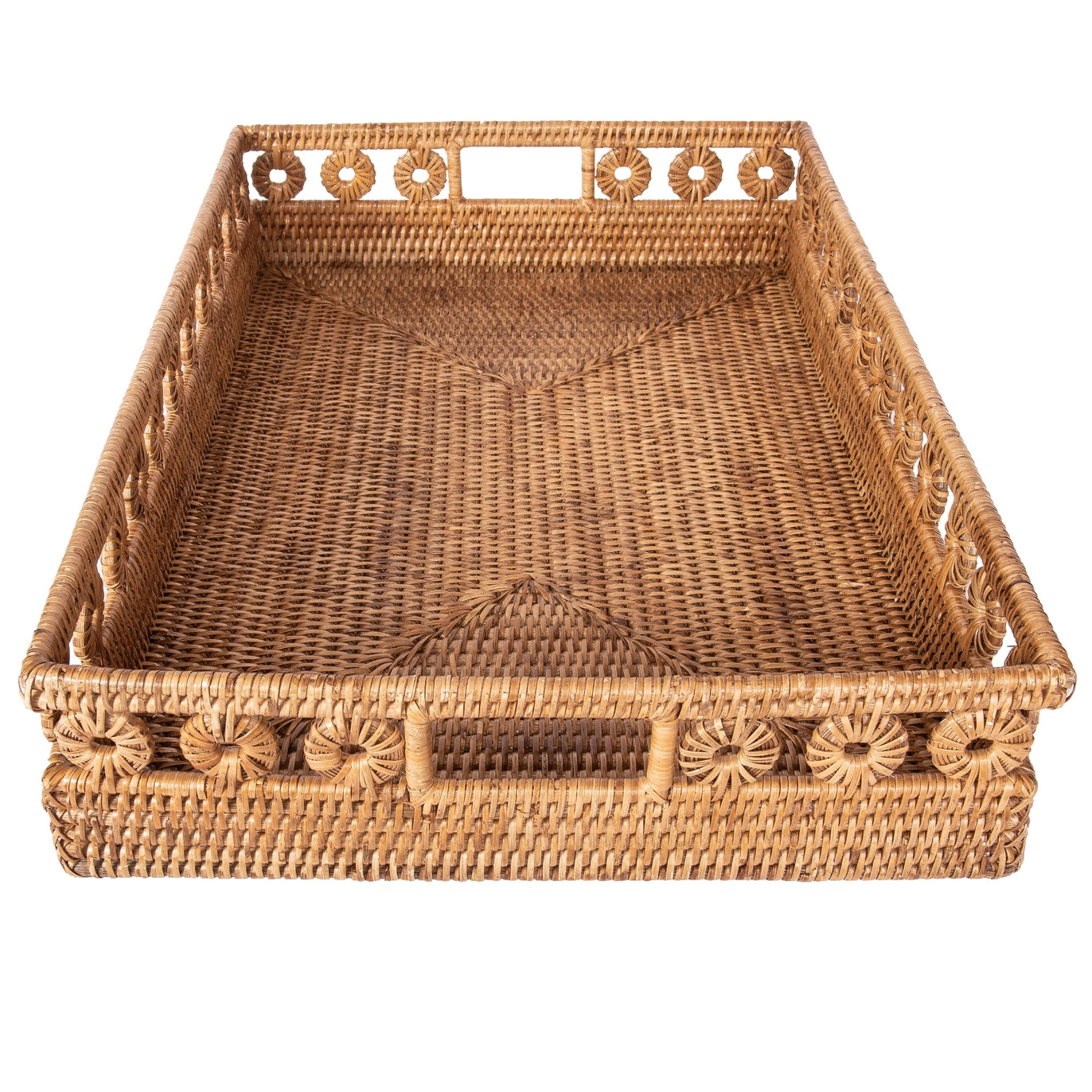 Elevate your home styling with this artisan-crafted rattan tray, designed to make a statement. The rectangular silhouette is framed with finely handwoven detailing, featuring elegant floral loop accents that bring a touch of sophistication to its natural texture. The dual built-in handles provide easy portability, making it as functional as it is beautiful. Whether used for serving drinks, organizing tabletop decor, or adding a refined accent to a console or ottoman, this tray blends traditional craftsmanship with contemporary flair. Its natural finish and timeless design make it a versatile piece for any home setting — from rustic charm to modern boho.