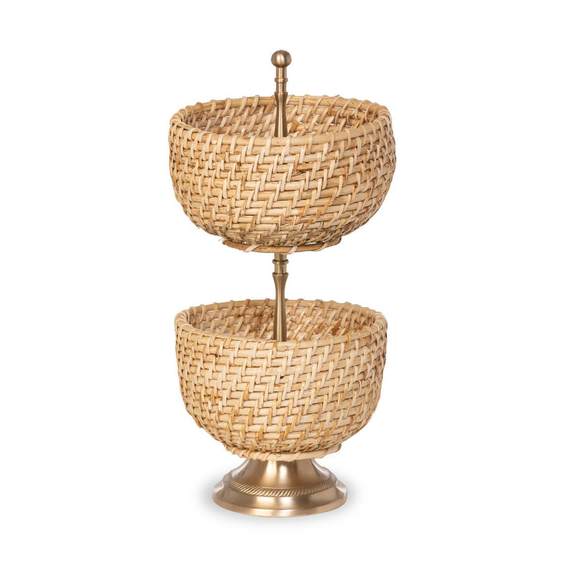 Elevate your storage and display game with this two-tier rattan and brass basket stand. Handwoven from natural rattan, the baskets boast a warm, organic texture, perfectly complemented by the sleek golden sheen of the brass frame. The sturdy two-tier design provides ample space for organizing fruits, bread, or decorative accents while adding a rustic-luxe touch to your kitchen, dining area, or living room. Equal parts functional and stylish, this stand is ideal for both everyday use and special occasions.