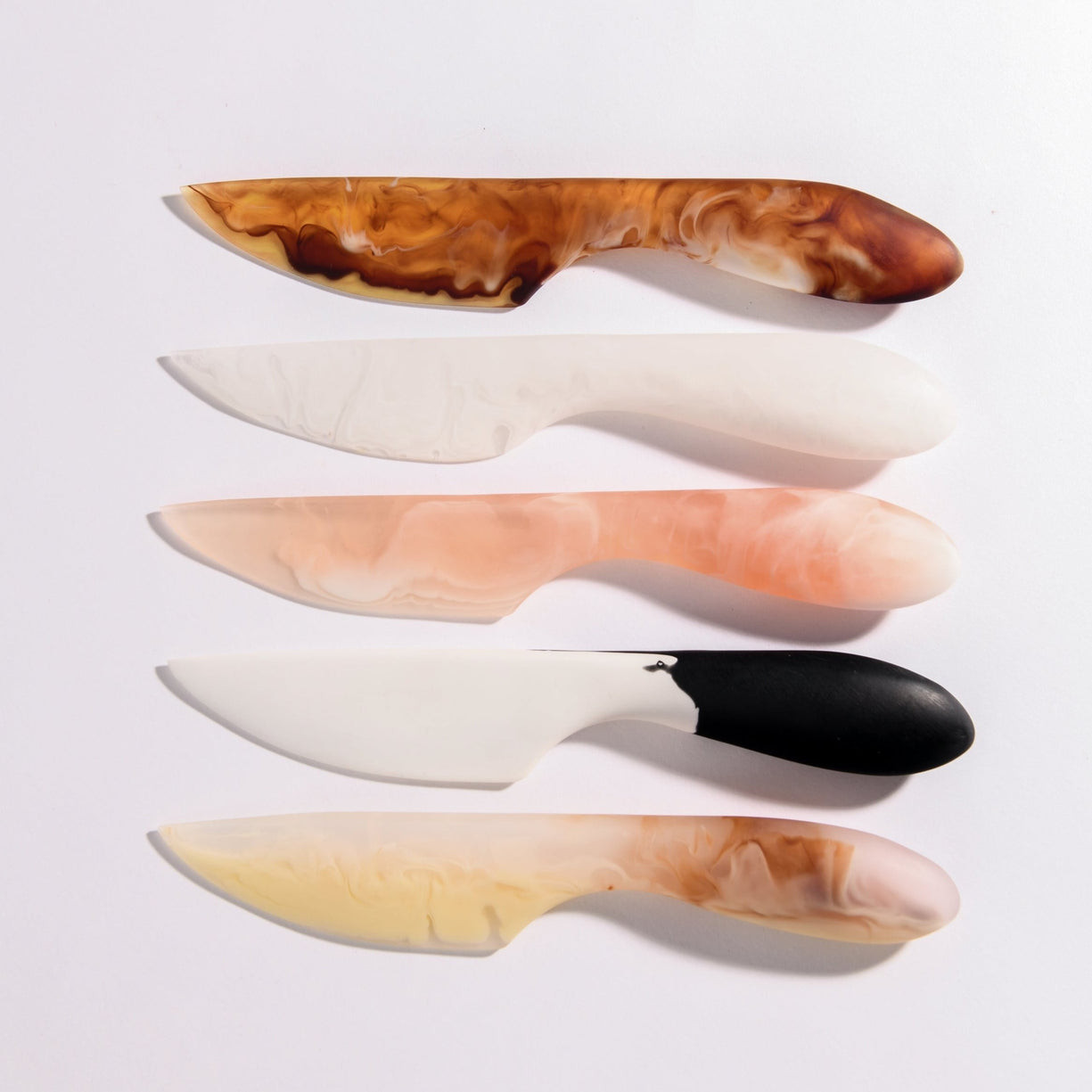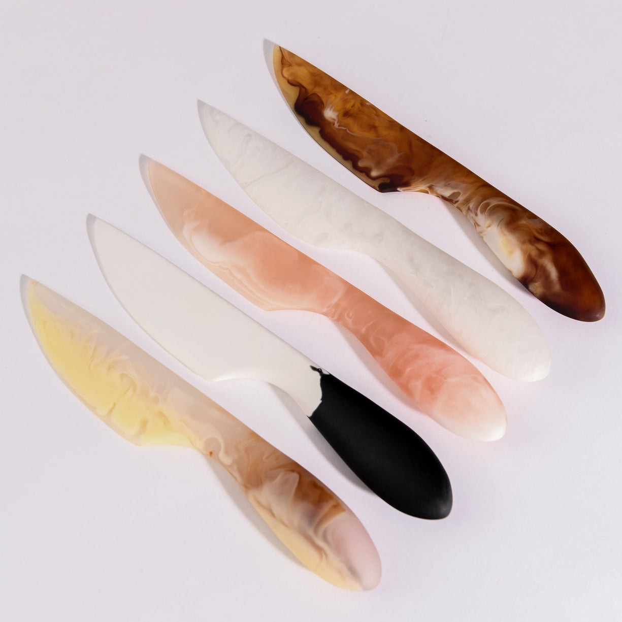 Crafted from premium acrylic, each knife features a smooth, ergonomic handle and a gently curved spreading blade, perfect for soft cheeses, butter, dips, pâtés, or desserts. The unique color blend in each piece ensures no two are ever exactly alike, making this set as visually striking as it is practical.