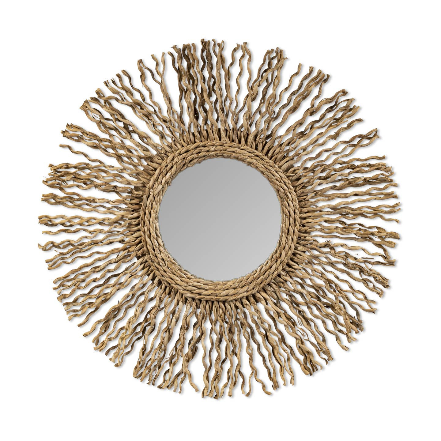 Radiating natural charm, this handcrafted mirror is woven from moojh grass—an eco-friendly fiber known for its strength, softness, and earthy beauty. Designed in a round sunburst pattern, the flowing, textured strands bring a dynamic sense of movement and warmth to any wall. The intricate central weave frames the mirror like a halo, creating an organic focal point that complements both minimal and bohemian interiors. Whether placed above a console, in an entryway, or as a statement piece in a living room, this mirror brings the calming essence of nature indoors.