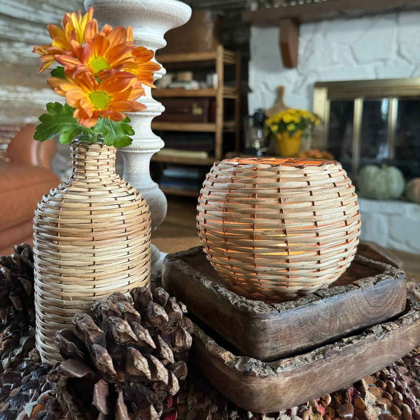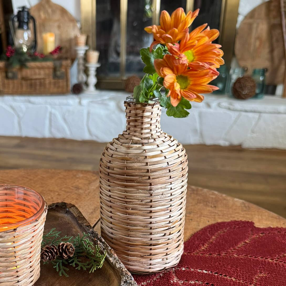 Where natural texture meets refined elegance—this rattan-wrapped glass vase is a beautiful blend of form and function. The clear glass body offers a sleek and clean silhouette, while the handwoven rattan wrap brings warmth, depth, and an organic touch. Perfect for displaying fresh blooms, dried stems, or simply styled as a decorative accent, this vase fits seamlessly into a variety of interiors—from modern minimalist to coastal and bohemian. Lightweight, versatile, and full of character, it’s a piece that effortlessly adds charm to any shelf, table, or nook.