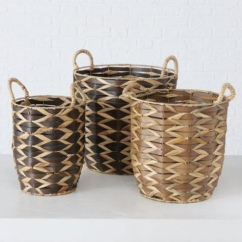 Discover the art of natural weaving with this beautifully handcrafted basket set, featuring three varied-size baskets designed for both utility and aesthetic appeal. Each basket showcases a distinctive zig-zag weave pattern, where alternating strips of dark and light natural fibers create striking visual texture. The tall, cylindrical form is complemented by sturdy rope handles, making these baskets easy to move and ideal for storage, display, or décor. Whether you’re storing blankets, firewood, plants, or simply adding an organic accent to your space, this basket trio fuses functionality with handcrafted charm. The warm tones of the natural material blend seamlessly with modern, boho, or rustic interiors—bringing nature indoors with elegance.